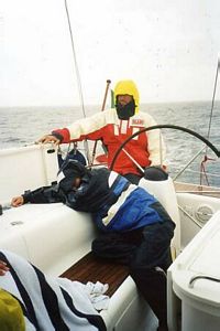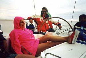 Francesco e Brunella si mettono a poppa per controllare la rotta, noi ci rannicchiamo sotto la cappotta della barca montata sopra il boccaporto. La pioggia continua a cadere per più di un'ora. Brunella chiede a Francesco se ha bisogno per le manovre e, avuta una rassicurazione negativa, si stende sul ponte protetta dalla cerata sotto l'acqua. Chiude gli occhi e si immobilizza. Probabilmente é dotata di un congegno di autospegnimento istantaneo. |