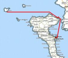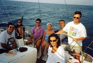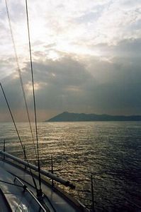 Adesso é il turno di Gherardo al timone. Il vento é di nuovo aumentato ed avanziamo di bolina aiutati dal motore. Alle 20 siamo davanti all'isola di Othonì e gettiamo l'ancora in rada. Come al solito il tuffo dell'Anna e di Giorgio segue di poco quello dell'ancora. Questa volta anche Alberto si butta. |