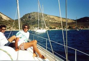 Spieghiamo le vele come la sera precedente, ora la velocità del vento é salita a trenta nodi, dobbiamo raggiungere Corfù e Francesco non cede il timone: cerca di far sviluppare alla barca la maggiore velocità possibile per arrivare al più presto nella parte dell'isola riparata dal vento. Prendiamo una seconda mano di terzaroli alla randa. La maggior parte delle manovre si fanno stando comodamente in pozzetto. Brunella scatta prontamente agli ordini del capitano dimostrando un'abnegazione superiore al normale. Quando siamo vicini alla punta est dell'isola la velocità del vento cala a quindici nodi. Apriamo tutta la velatura e la barca fila di nuovo veloce sulle onde. Poco prima del canale che si forma fra l'isola di Corfù e la costa albanese, Francesco accosta diretto verso una piccola baia riparata. Ci buttiamo tutti in acqua. Giorgio, mio nipote di quasi quattro anni, munito di pinne, maschera e bracciali non esita un attimo. L'acqua non é fredda e si nuota con facilità. Quando é ora di buttare la pasta nessuno vuole rientrare. Poi dopo molte insistenze alle 16,30 riusciamo a metterci a tavola. Il capitano per lasciarci più spazio si siede al tavolo di carteggio. Un chilo di maccheroni, condito col ragù che la Betta ha preparato a Rimini, viene fulminato. Quando ci alziamo da tavola ci accorgiamo che Anna e Giorgio sono di nuovo in acqua e facciamo fatica a persuaderli ad uscire di nuovo per ripartire. Brunella si prepara per salpare l'ancora. Tutti ostentiamo indifferenza ma siamo preoccupati per la manovra, visti i risultati delle due precedenti occasioni e temiamo che Francesco debba di nuovo tuffarsi. Ma questa volta tutto fila liscio. La barca non si é mossa e l'ancora non ha agganciato nessuno scoglio. |